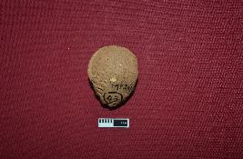 | Description / विवरण | Broken part of a human head in brick brown colour. The figurine is hollow inside. Only the left side thin projected eye brow and elongated bulged eyes are remained. Incised linear dot designs on the left side of the head indicate an attempt of some kind of coiffure while the rest of the head is plain. |
