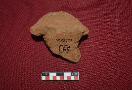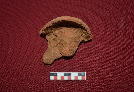 | Description / विवरण | Broken part of a hooded head of a human figurine in brick brown colour. The facial features are almost eroded, elongated eyes, thick broad nose and lips are eroded. Elongated ear lobe is seen on the left side, while it is broken and missing on the right side. Incised marks indicating strands of hair is seen between the curved hood and forehead. The back side of the figurine is flat |