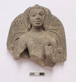 | Description / विवरण | The Bust of Buddha has curly hairs with ushnisha the eyes are open and elongated ears and the left hand is upward raised; The stele is beautifully decorated |
