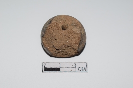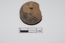 | Description / विवरण | It is a terracotta bead. It is an areca nut shaped bead. It is black in colour with a brown core. It is chipped off from one side. The surface is slightly rough. The core has particles if mica. |