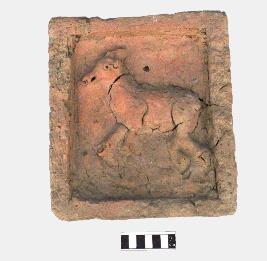 | Description / विवरण | This terracotta plaque represents an animal figure. It has a pointed mouth showing visible nostrils, a round prominent eye and broken ears. The body of the figure is decorated with visible spots which represents the figure of a deer. The legs and hooves were also visible with marks in it, the right forelimb and right hind leg were highly eroded. The tail is missing. |