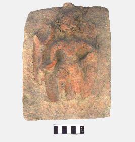 | Description / विवरण | This terracotta plaque represents an unknown figure in standing position. The face, head, hands and the body is very eroded and unrecognisable. The figure seems to be wearing a kundala on its right ear (the ornamentation on the left ear is eroded). The left arm of the figure is folded downwards holding its hips while the right arm is rested downwards holding an unidentified weapon. The figure is also wearing a decorated antariya reaching its knee. The feet is missing. |