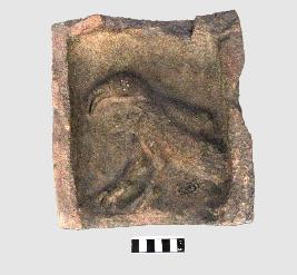 | Description / विवरण | This terracotta plaque symbolises an unidentified bird comprising a very large eye, a huge pointed beak and sharp claws. It also shows fan shaped tail feathers with visible structures in it and a highly eroded limbs. |