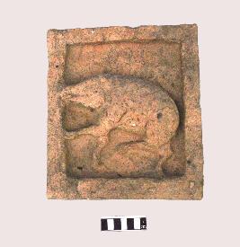 | Description / विवरण | This terracotta plaque represents an unidentified fauna in a running position. It has a pointed face with visible left eye and an opened mouth and the snout (nose) which depicts the face of a wild boar. The left foreleg and left hindleg were lifted upwards in a running posture while its right foreleg and the right hind leg were placed on the plaque. The hooves of the animal is eroded, the tail and ears are missing. |