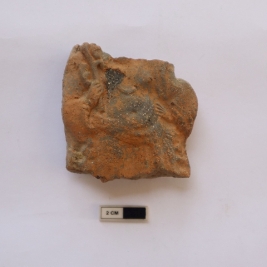| Description / विवरण | A broken terracotta human (woman ) plaque. In the right hand it is holding something plant like object. Head and legs are missing and color of object is red |