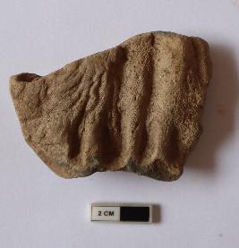 | Description / विवरण | Terracotta plaque, depicting a two human figures. Only the legs are noticeable. Object is dull red in color |