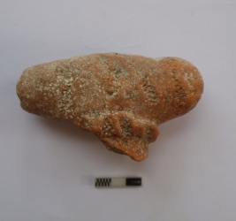 | Description / विवरण | Broken part of a Terracotta plaque, depcting the face and head. The specimen is notable for its elaborate coiffure adorned with feathers. Heavy ear ornaments are also discernible. Object is red in color |