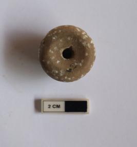 | Description / विवरण | A Ghat shape bead. It is red in color and partially damaged |