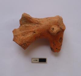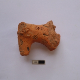 | Description / विवरण | A terracotta animal figurine. Horn and back portion of body including legs are missing. Decoration and stamp marks can be seen over the body |