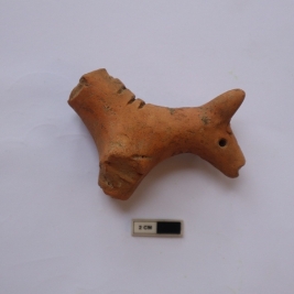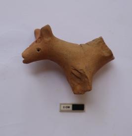 | Description / विवरण | A terracotta animal figurine. back portion and legs are missing. It is red in color. Decoration marks (lines impression) is visible on the body |