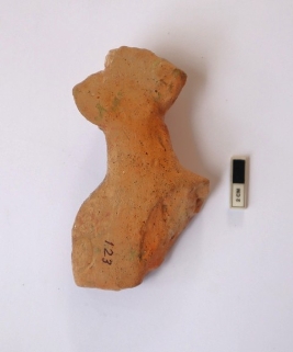 | Description / विवरण | A terracotta human figurine. Half portion is missing and head is damaged. Stamp marks is visible over the body. |