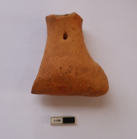 | Description / विवरण | A terracotta animal toy cart. There are three holes on the surface which was used for fix the wheel and stick. Head portion of body is missing and color of object is red |