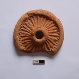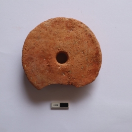 | Description / विवरण | A terracotta wheel in a circular shape. It is red in color and partially broken |