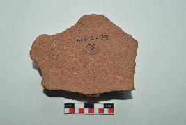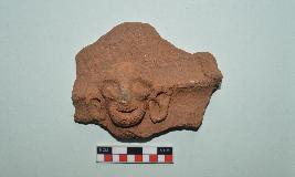 | Description / विवरण | A human head on a potsherd in brick brown colour. The face depicted on the potsherd is oval in shape. The facial features include bulged eyes, thick nose, lips are broken and the mouth is open with a deep incision. Earlobes are shown long and elongated where its interior are marked with two shallow holes. The head is bald. |