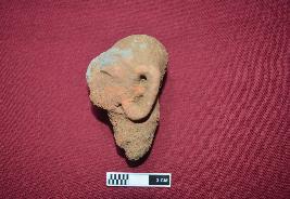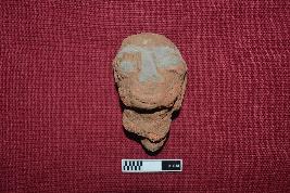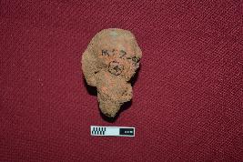 | Description / विवरण | Broken part of a figurine consist only the head of a human with neck portion in brick brown colour. The face is almost round in shape. The facial features are highly eroded which include mark of eye brows, elongated bulging eyes and thick abraded nose. The lip portion is broken except a mark of lower lip. At the right side except small earhole, ear is missing while the left ear is completely visible. Small piercing holes are visible on the left side ear. Neck part is visible. The pointed end portion of the neck indicates it was inserted to the body part. Head is bald |