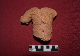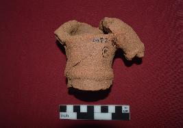 | Description / विवरण | Fragmentary hollow male torso in brick brown colour. The upper half portion of the right hand is broken which has been affixed using adhesive and an armlet with a band and a circular flat projection in the center is present on the upper arm. The left side hand is completely missing and broken. The broad chest is having an armour like depiction made of applique technique designed with nail mark or horizontal lines made with some pointed tool is one of the noteworthy feature. Above which, a special applique pattern with linear designs is shown, resembling a cross belt or garment on the right side. In the stomach part, a pierced hole is made to indicate the navel portion. Around the belly button an applique udarabandha is also shown. |