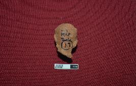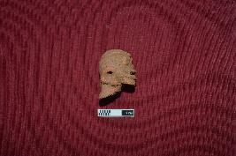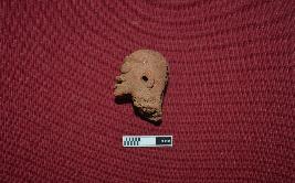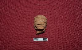 | Description / विवरण | Solid head of a human figurine. It is brick brown in colour. The face is oval in shape with chin jut towards front. Facial features are of applique technique such as thick eyebrow, rounded and bulged eyes with protruding lower and upper lips with a horizontal grove in between to indicate an open mouth. Two pierced parallel placed holes at the either side of the figure indicate ear holes, the nose and ears are missing. The head is bald. It has coarse to medium fabric. |