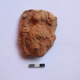 | Description / विवरण | A terracotta plaque. Woman figurine is visible on the surface. Head and legs are missing. it is red in color |