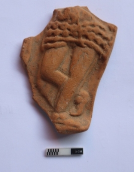 | Description / विवरण | A terracotta plaque, depicting a human figurine. Human is standing (dancing ) in a posture. Upper portion of body is missing |