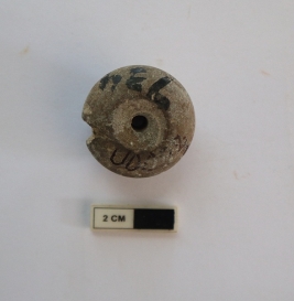 | Description / विवरण | A terracotta arecanut shape bead. It is black in color and partially damaged |