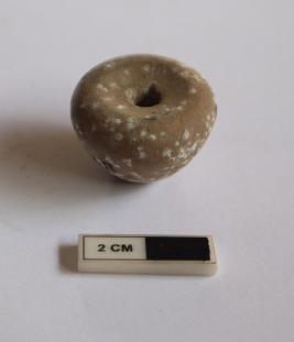 | Description / विवरण | A terracotta bead in a arecanut shape. It is dull red in color |