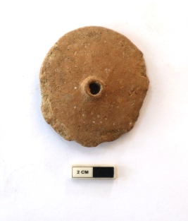 | Description / विवरण | A terracotta wheel in a circular shape. It is partially broken and red in color. |