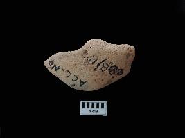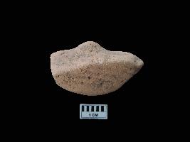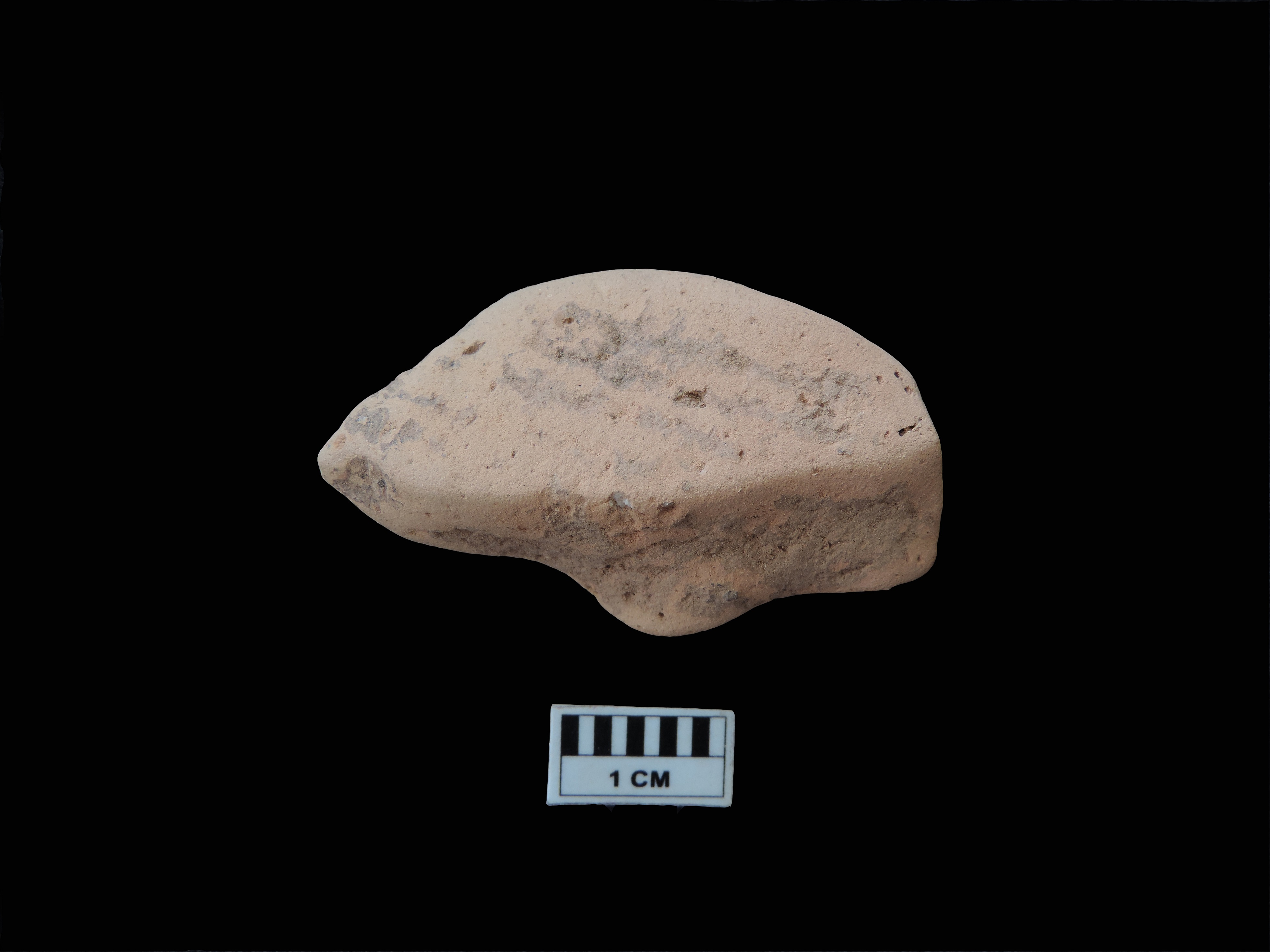 A terracotta seal, which is completely broken. There is an elongated raised area in the centre of the seal. The elongated raised area is a place to hold it. Few black lines or writings are visible on one side of the raised area. The other face is completely plain. No symbols or markings are visible on the seal.