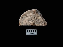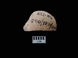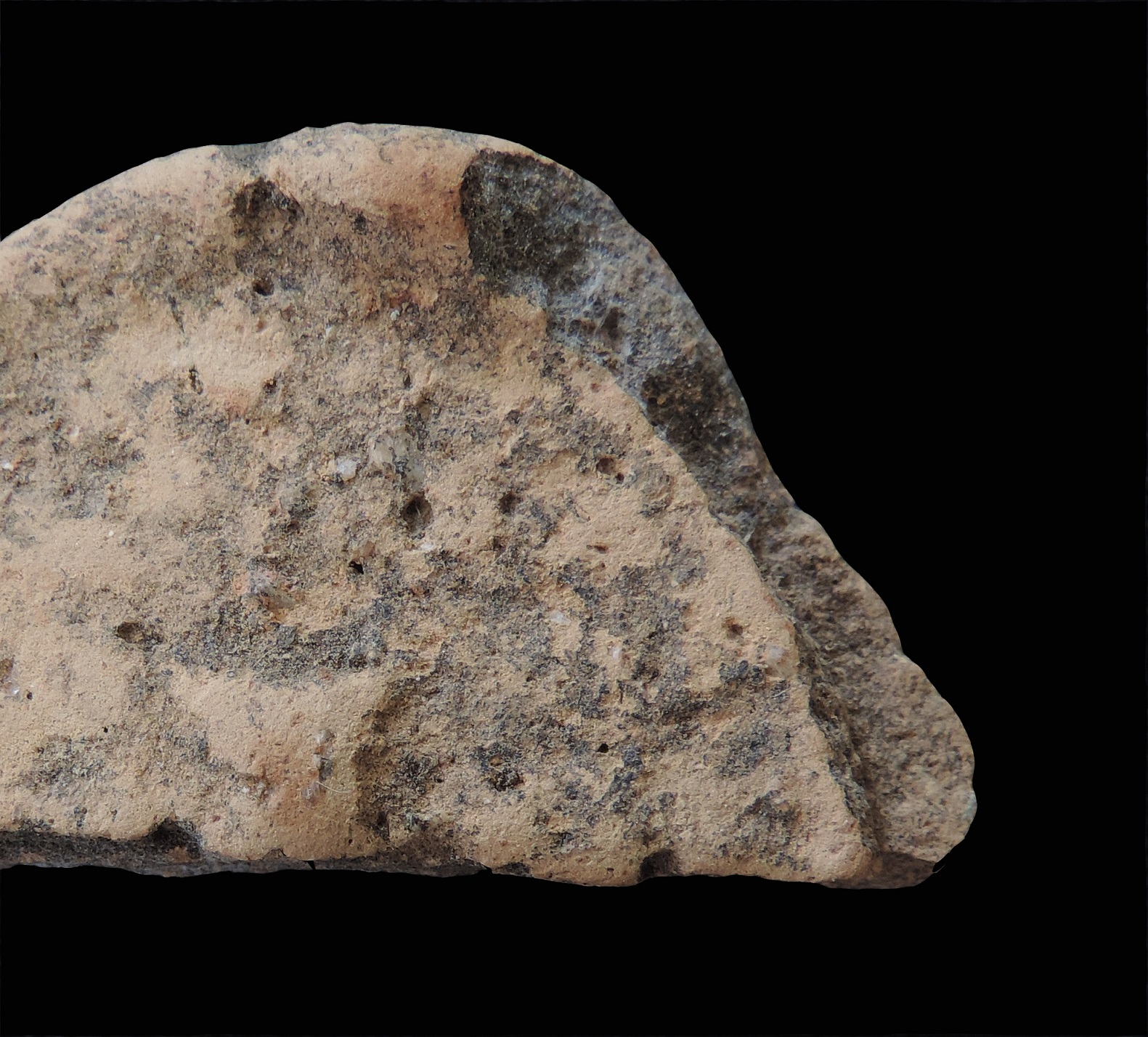 A terracotta half circular seal with raised edges. A small raised symbol is visible near the broken part in the centre. One side is covered with black colour patches. The other sides is completely plain.