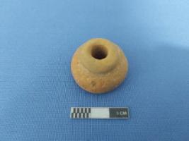 | Description / विवरण | The object is red color ghat shaped bead. It has rough and corroded surface. The rim portion has curve around the worn out edge. It has the curvy base has been turned inward with a groove around the perforation. The object is dropping ochre color. |