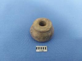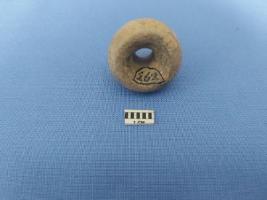 | Description / विवरण | The red color ghat shaped bead has rather smooth surface with discoloration. The bead s curvy base has been turned inward till the edge of perforation. |