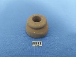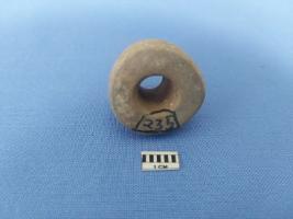 | Description / विवरण | The ghat shaped bead has evidence of discoloration It has the flatten base has been turned inward with a mild groove around the perforation. It is not well finished product. The smoothness over the rough surface is result of continuous detrition. |