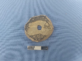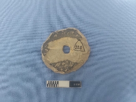 | Description / विवरण | The object is an antiquity with almost circular diameter and a perforation in center. It could have multiple use as an object of games and amusement. The object is made out of very fine but abraded piece of potsherd. |