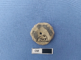 | Description / विवरण | The object is a subject of games and amusements which has almost circular shape and two perforations on its flat surface. It may have been use as net sinker. |