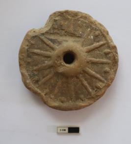 | Description / विवरण | A wheel depicting a prominent central hub and radiating spokes. Edge portion is damaged. |