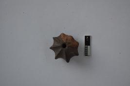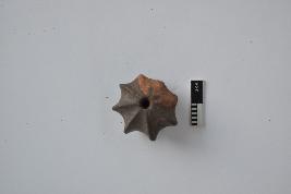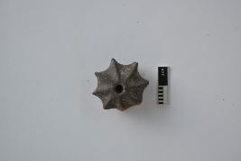 | Description / विवरण | Over baked gadrooned shaped terracotta bead. The bead is broken from one side and its black in colour. |