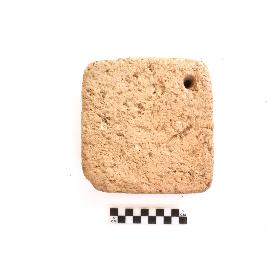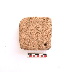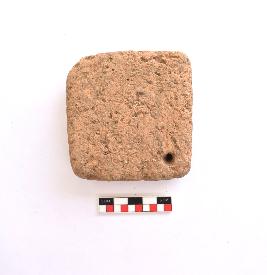 | Description / विवरण | This skin rubber is made of baked fine clay. It is rectangular in shape. The surface of the rubber is rough and on one corner a hole is seen which was probably for binding it with a string. |