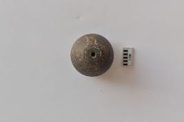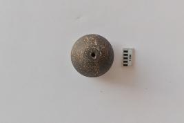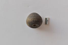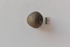 | Description / विवरण | A terracotta arecanut shape bead with incised design on surface. The bead is black in color. |