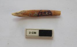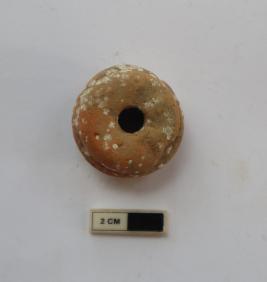 | Description / विवरण | A ghat shape bead. It is red in color and partially damaged |