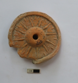 | Description / विवरण | A wheel in a circular shape. It has a prominent hub and radiating spokes. It is partially broken and dull red in color. |