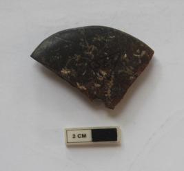 | Description / विवरण | A Ghat shape bead. It is dull red in color and partially damaged |