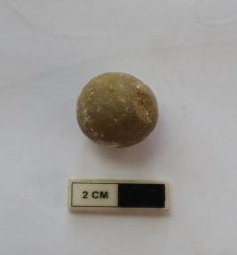| Description / विवरण | A sling ball in a spherical shape. It is gray in color and partially damaged |