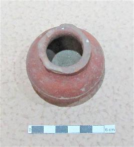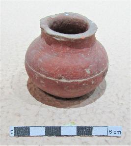 | Description / विवरण | It is a miniature terracotta vase having inverted rim, carinate body and flat base. The vase having red slip on dull red ware with very coarse fabric, two incised lines are running on the body of the base.. |