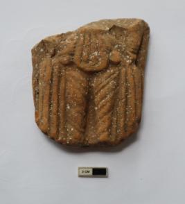 | Description / विवरण | Fragmentary plaque depicting a human body from the waist down. The feet again are missing. Both the hands are on waist akimbo. The folds of the drapery are prominently shown. Possibly a female figurine. |