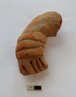 | Description / विवरण | The extant piece is a human hand. The fingers are suggested by deep incisions. There are appliqued bangles around the wrist. |