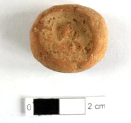 | Description / विवरण | It is a Terracotta sealing of baked clay. The upper half, which separated from the lower by a double horizontal line, depicting two deer and a wheel in-between, below it there is legend which is worn out. |