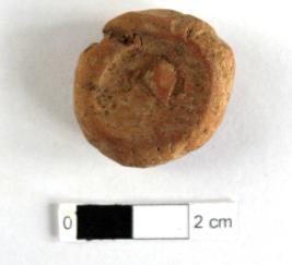 | Description / विवरण | It is a Terracotta sealing of baked clay. The upper half, which separated from the lower by a double horizontal line, depicting two deer and a wheel in-between, below it there is legend which is worn out. |