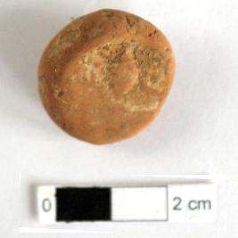 | Description / विवरण | It is a Terracotta sealing of baked clay. The upper half, which separated from the lower by a double horizontal line, depicting two deer and a wheel in-between, below it there is legend which is worn out. |