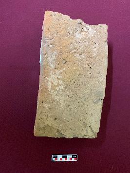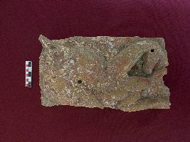 | Description / विवरण | Terracotta decorated plaque, showing a crocodile swallowed a man. The object is low in relief. |