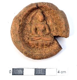 | Description / विवरण | It is a circular Terracotta sealing of baked clay with Buddha seated in dhyanmudra on a lotus. It is broken into two pieces. |