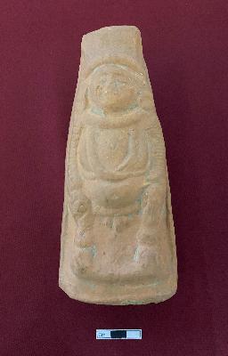 | Description / विवरण | This is a terracotta male figure in red colour. The figure is in a seated on some object. Both of the hands are resting on knee. Facial expression is not sharp at all. A rounded headgear and rounded necklace can be seen. Both of the arms are decorated with full of bangles. The object is hollow is nature with a perforation in backside. |